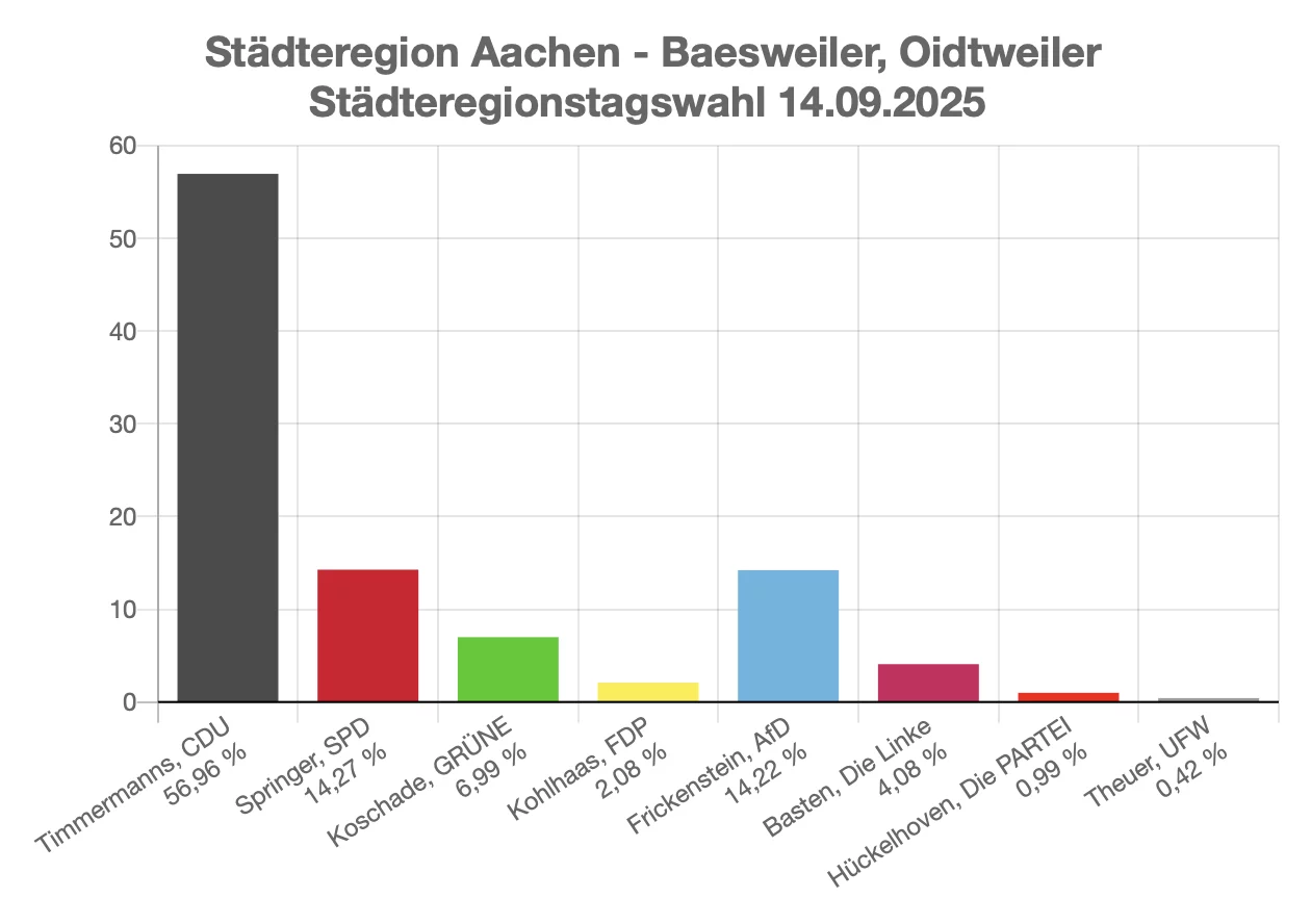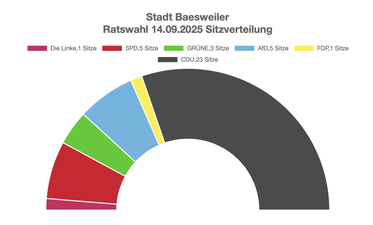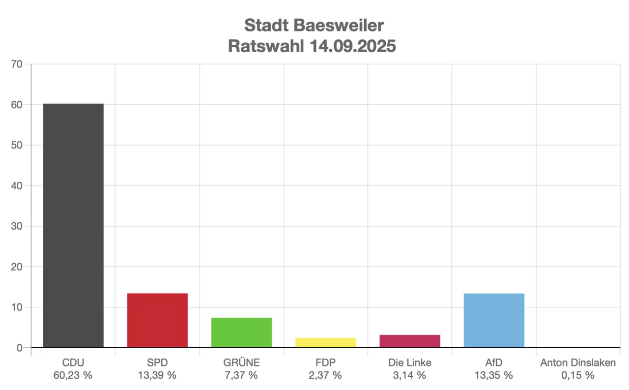 Für die Wahl des Stadtrates konnten alle Baesweiler Kandidaten Ihre Wahlbezirke gewinnen. Insgesamt liegt das Ergebnis bei 60,23 % der Wählerstimmen, damit wurden 23 der 38 Ratsmandate errungen.