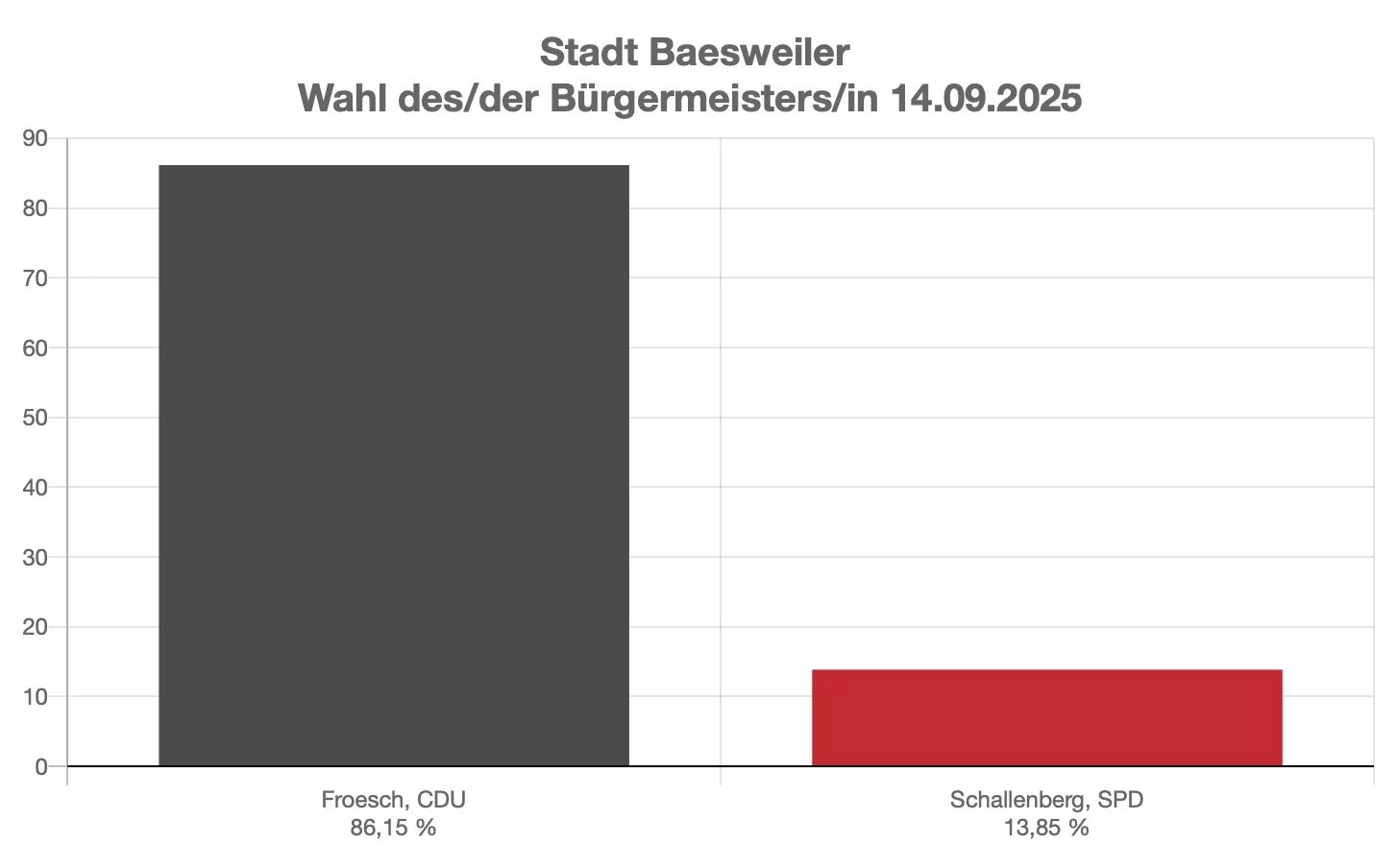 Unser Bürgermeister Pierre Froesch wurde mit 86,15 % der Stimmen - das entspricht einem Stimmenzuwachs von fast 6% -wiedergewählt. Das ist eine Bestätigung für eine sehr gute und überzeugende Arbeit für Baesweiler in den letzten 5 Jahren.